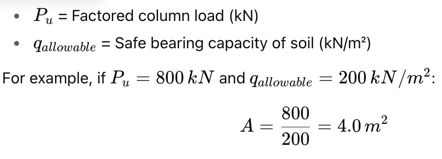 Required area = 900 / 225 = 4.0 mยฒ โ Use 2.0m ร 2.0m footing