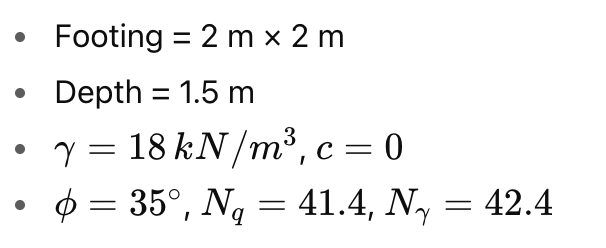 Ultimate Bearing Capacity (qu) | Maximum load before soil failure. | Used in theory. |